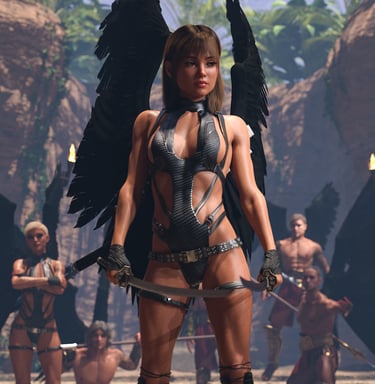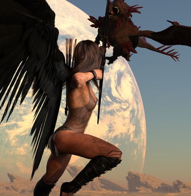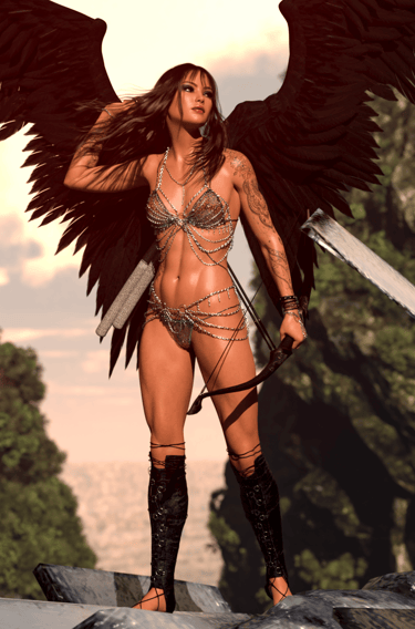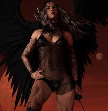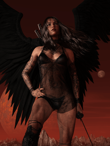 Dragons stalk the skies. Mutants crawl from the wastelands. Ogres march from the ashes of fallen kingdoms. She stands… against them all, wings black as midnight, eyes burning with defiance